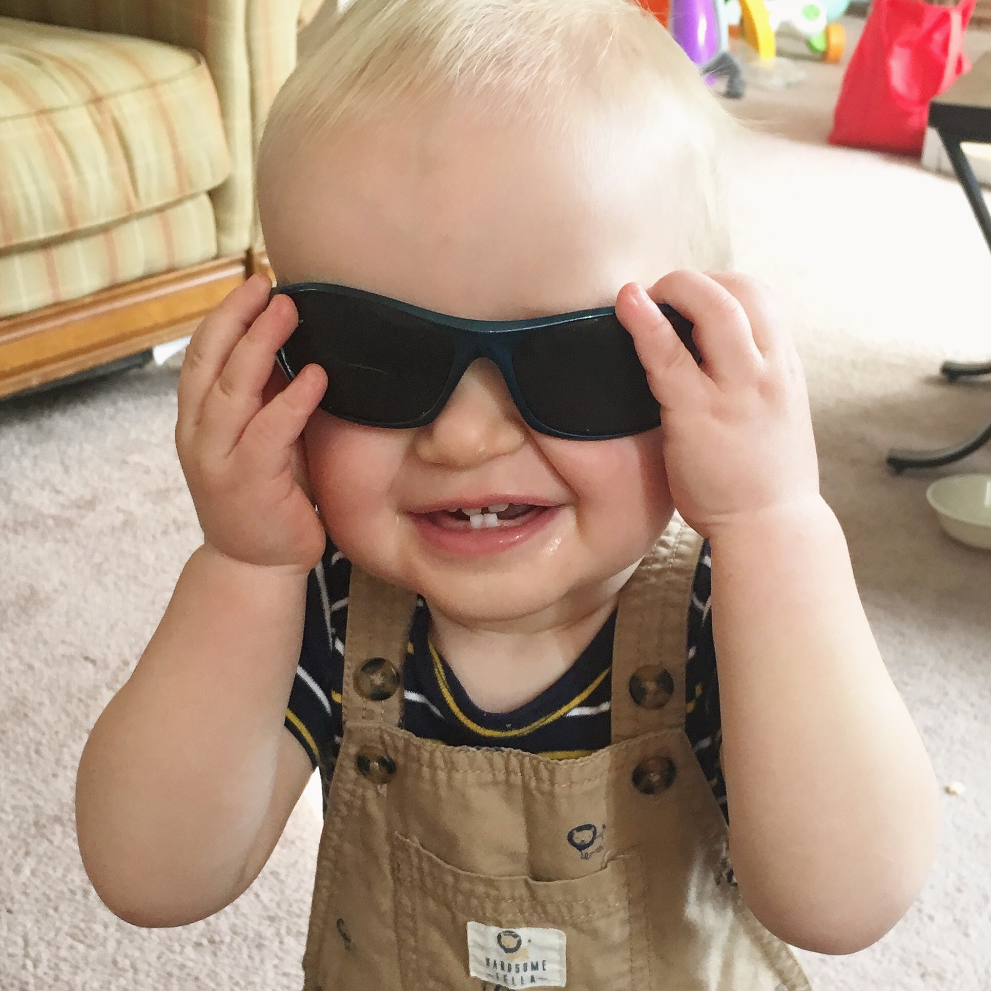 Spencer found his sunglasses and kept holding them out for me to put on his face, then he would run to the corner giggling and take them off and come back. Eventually he got tired and went down for his afternoon nap. More laundry, and more dishes. Pick up toys again. When he wakes up, I have to vacuum… again.