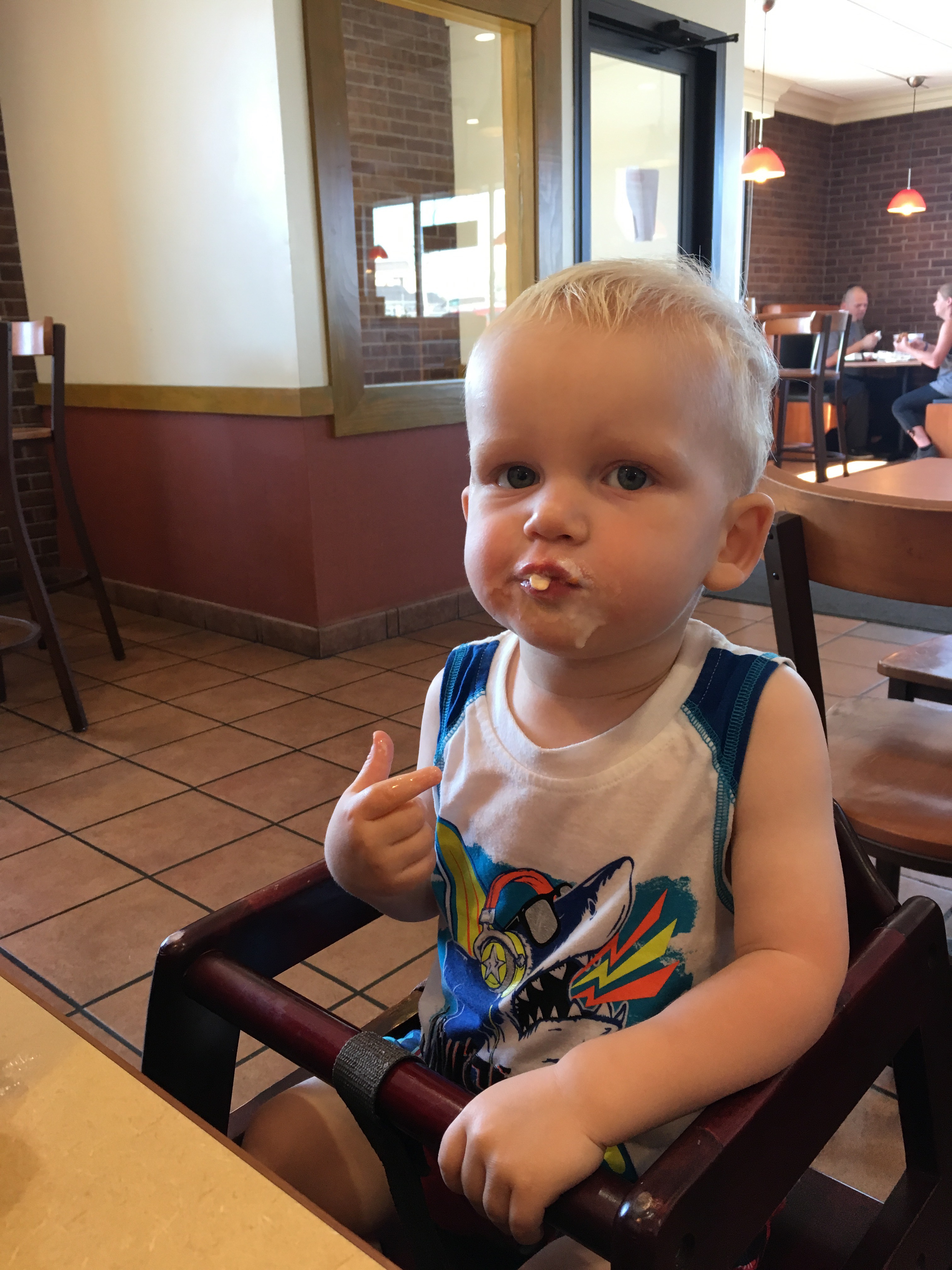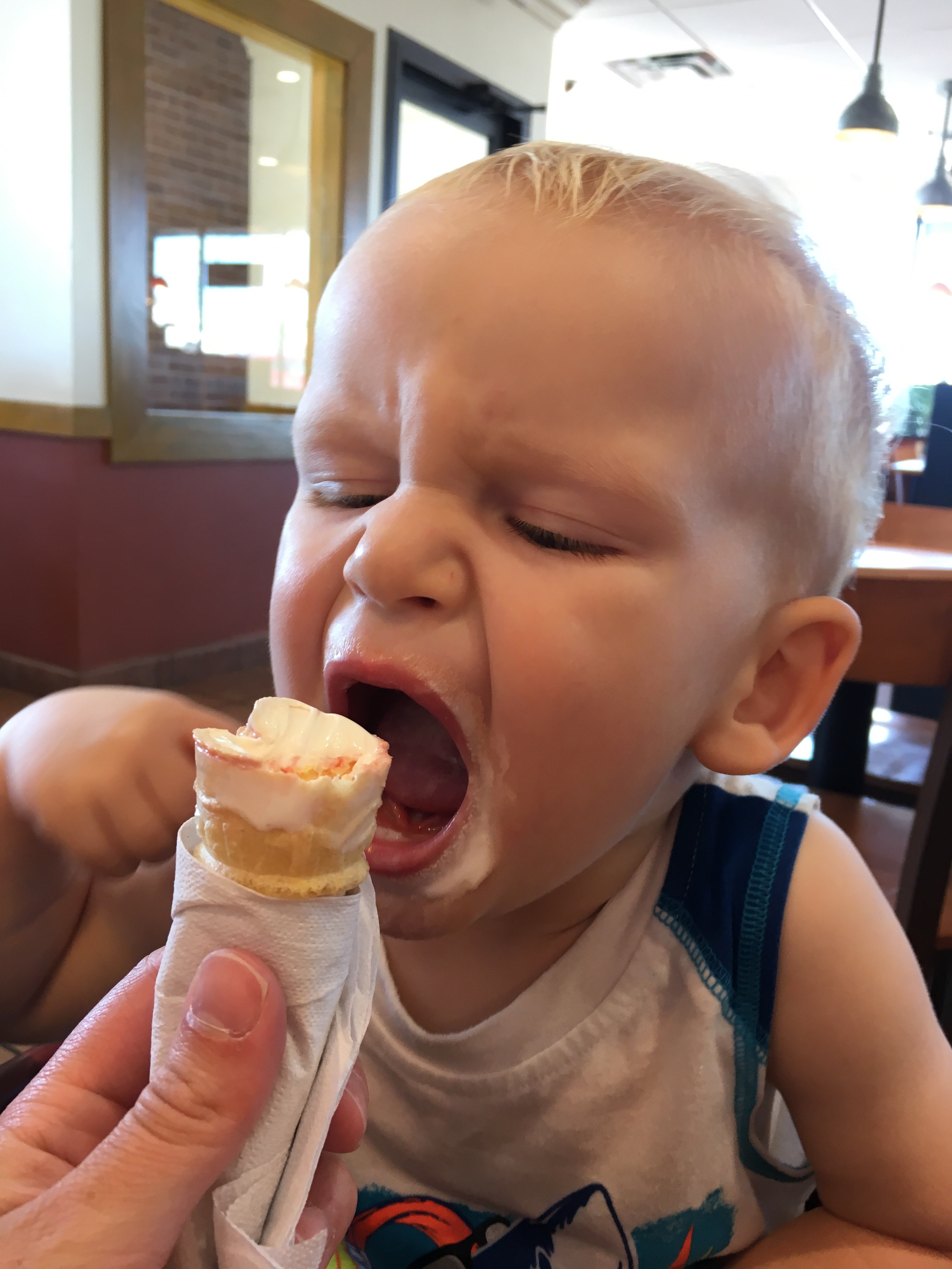 We took Spencer back to the playground after his nap and he had a blast. He was cracking us up in the car by trying to sing along with the music and loudly demanding certain songs with his limited vocabulary. We are enjoying this age so much. We stopped for ice cream at Lion’s Choice on the way home – they have flavor bursts now and they’re super cheap. They messed up our order so Spencer ended up with two baby cones.