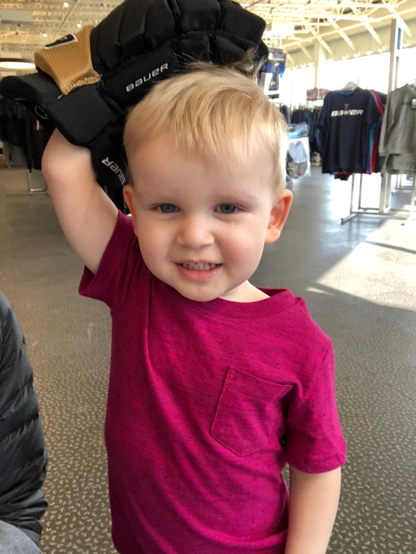 We walked next door to Pure Hockey after that and Spencer tried on a bunch of different gloves. His favorite was the pink one.