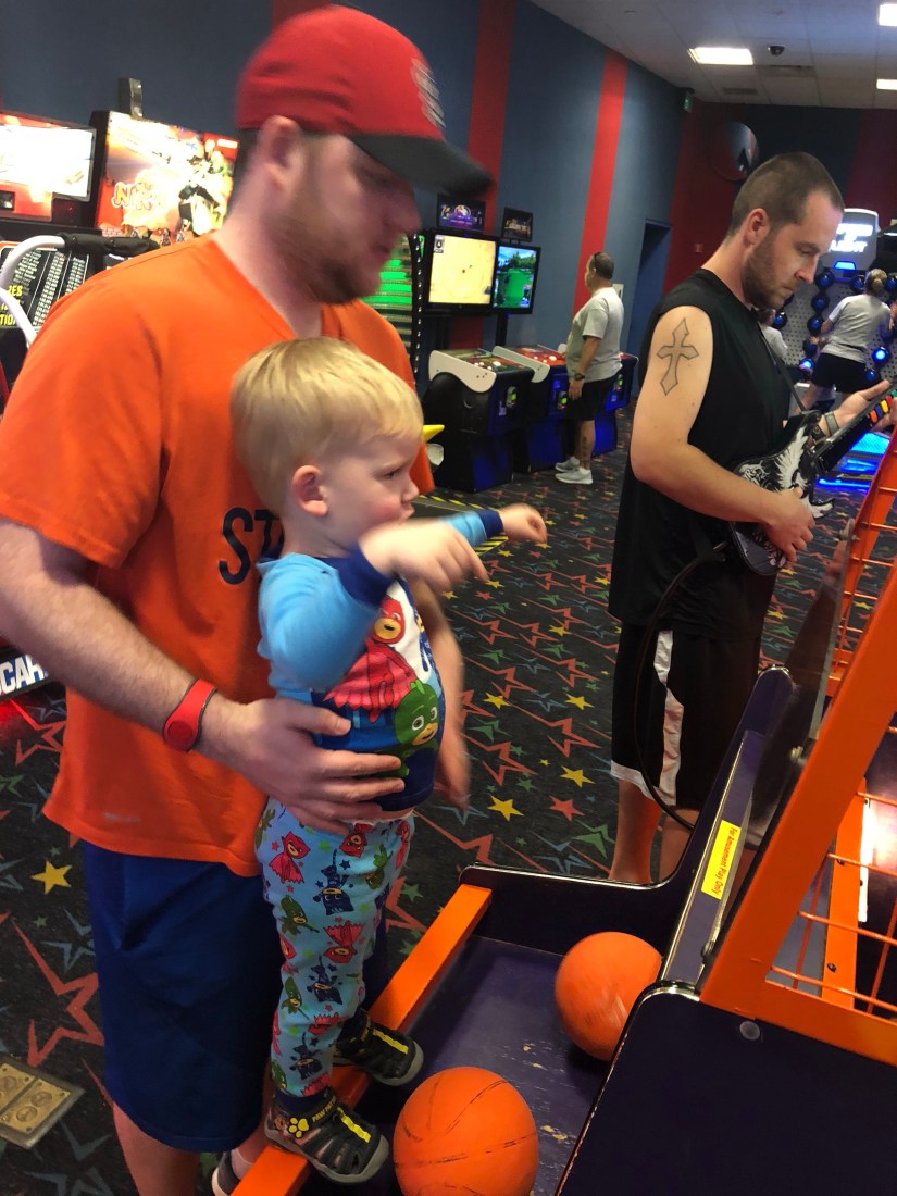 After swimming, we changed and ate dinner in the food court, then played in the arcade. We took a walk after it was dark and watched some fireworks over the tree line. It was a nice relaxing evening after two busy days at the parks.