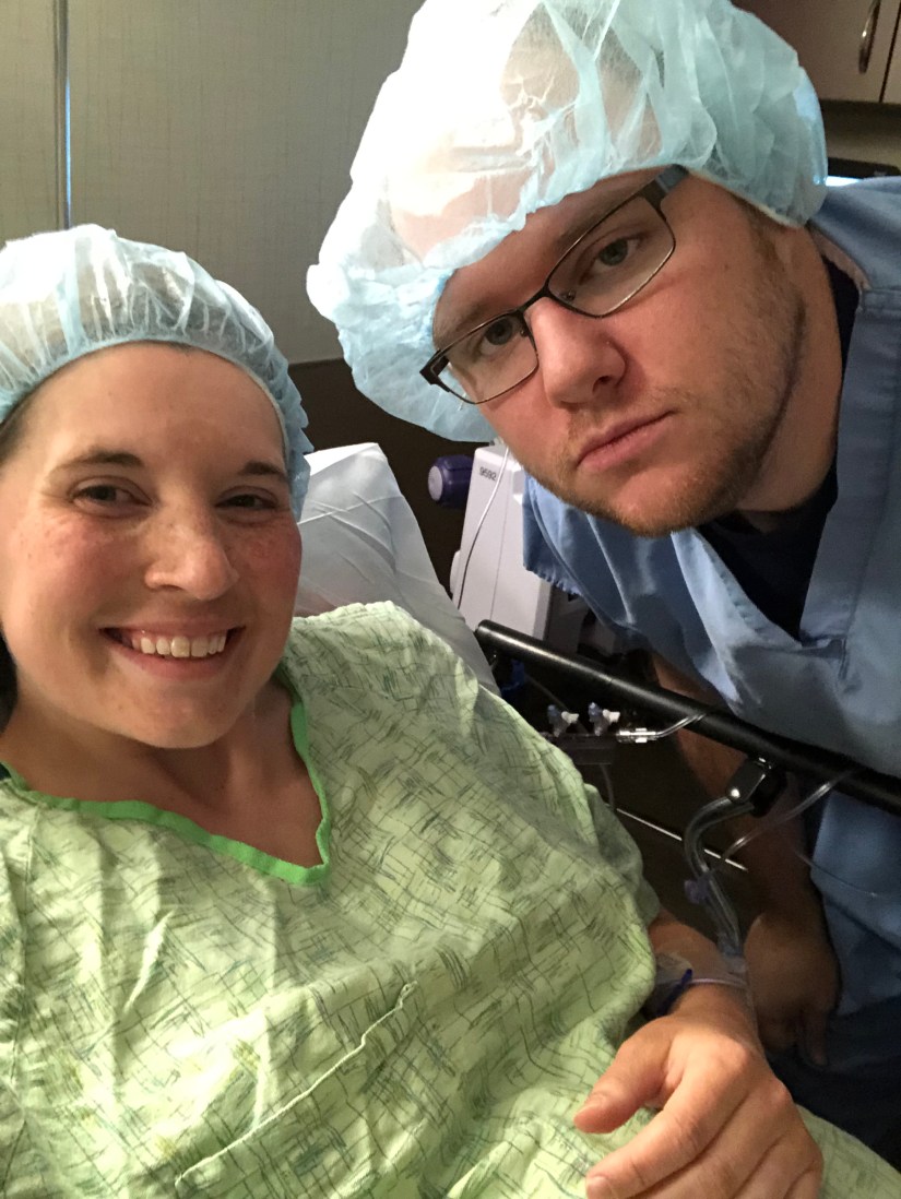 We waited a little longer while they prepped the OR – my surgery got pushed back about 30 minutes due to another delivery. They wheeled me back and made Jordan sit in the hallway while they did my spinal block.