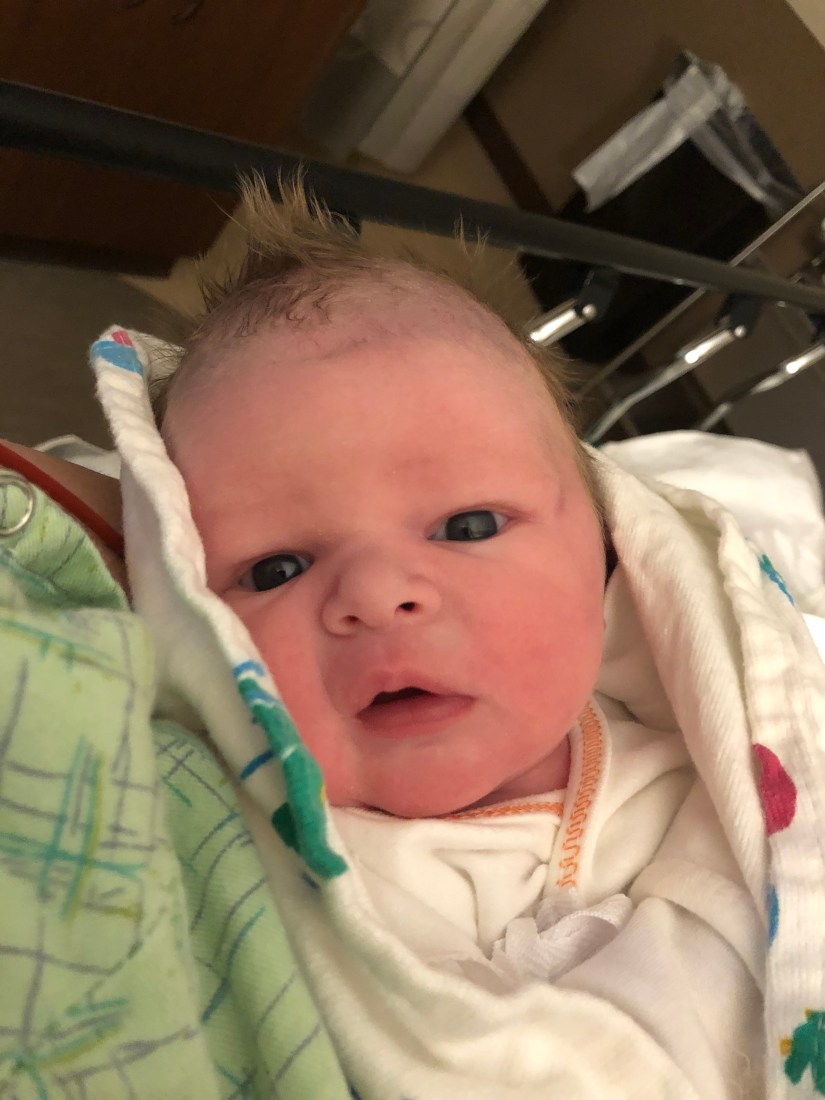 After 5 or so minutes, my doctor said “here she comes, she has a lot of hair!” That made me so excited because I envisioned her coming out with a head full of dark hair. They showed her to us and we couldn’t believe how much she looked like her brother. She had a lot of fluid to suck out so they took her to the nursery while they finished up my surgery. Not much later, I was back in my recovery room eating ice chips, trying really hard to move my numb feet, and finally holding my baby.